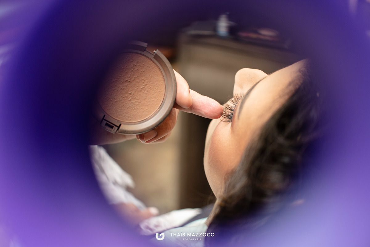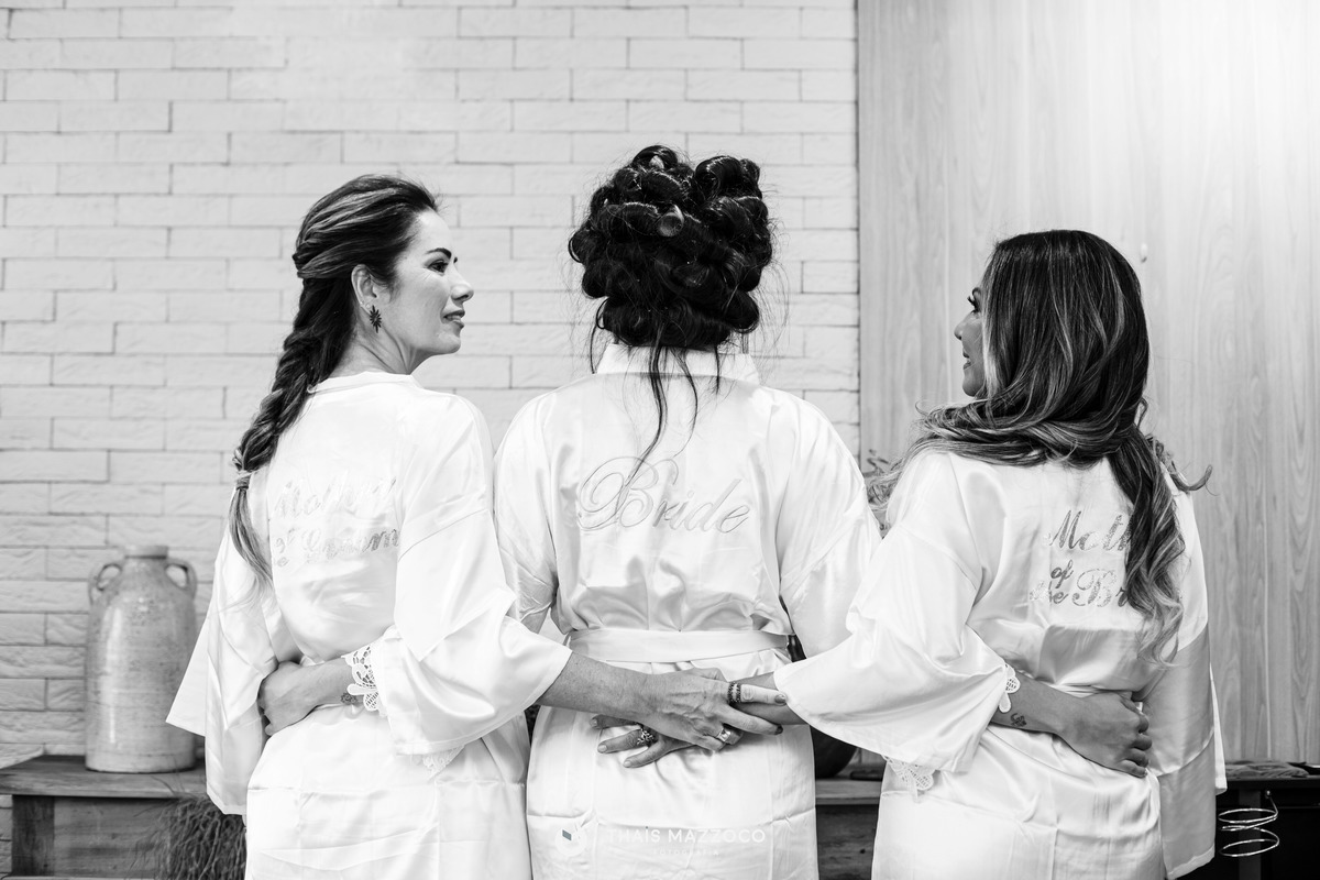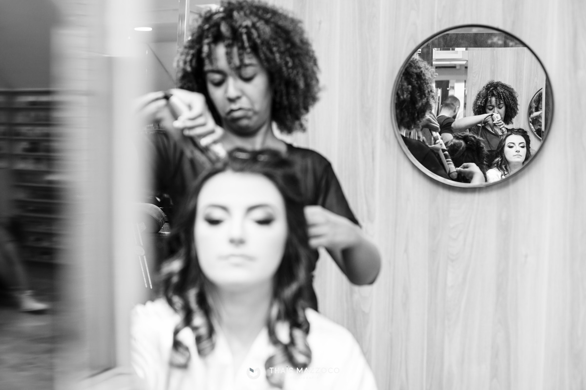 A comemoração já começou no Salão Studio K Beauty Center com as mães e convidadas se arrumando ao mesmo tempo. Para mim é sempre muito bom fotografar o making of da noiva pois a gente já vai quebrando o gelo, todas já começam a se sentir mais a vontade com as câmeras, e nesse caso eu também tive a oportunidade de conversar com as convidadas, na festa a gente já estava até rindo juntas. Só foi meio difícil saber quem era mãe, porque todas tão joviais, ainda bem que tinha roupão identificando.
