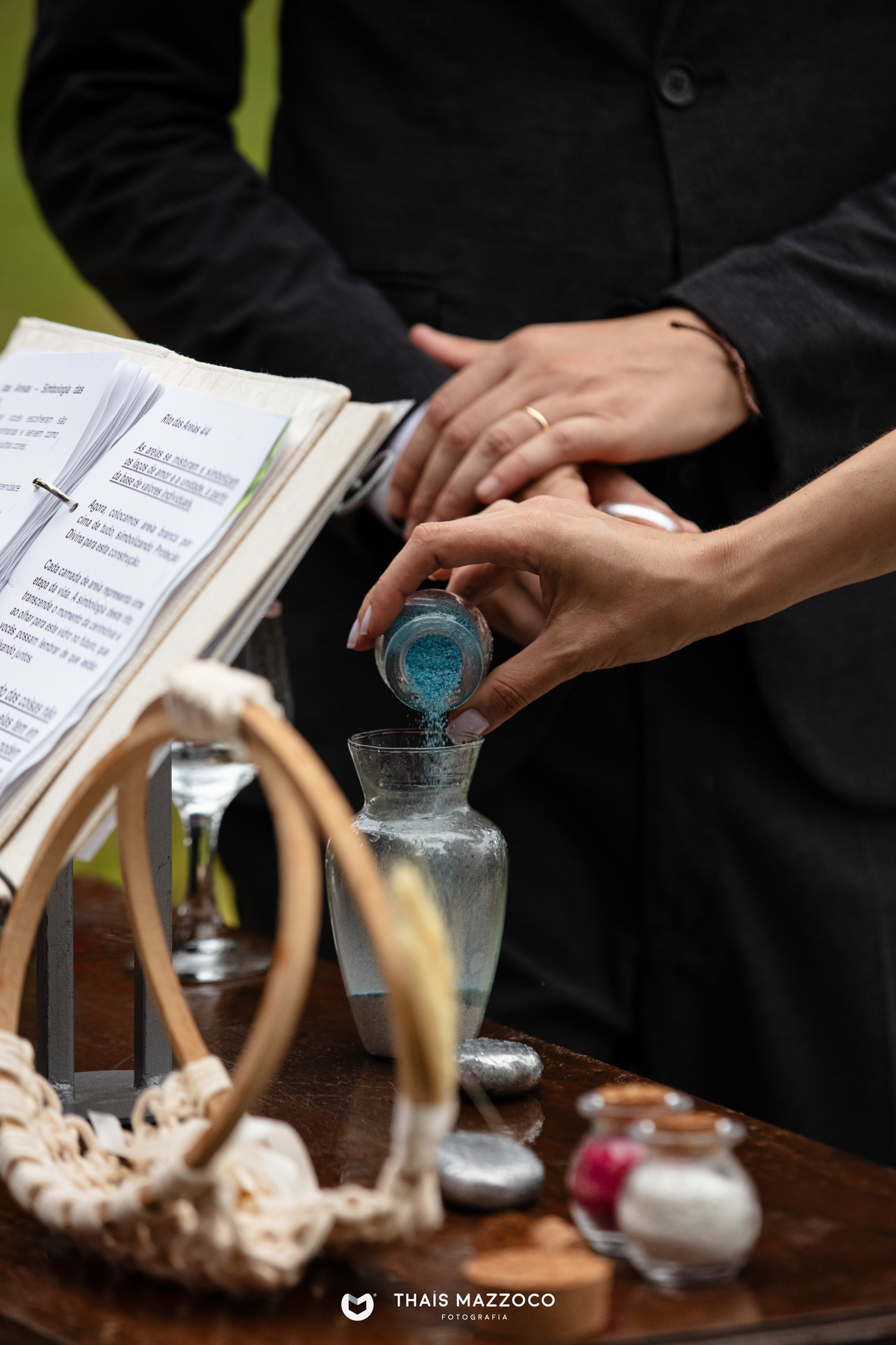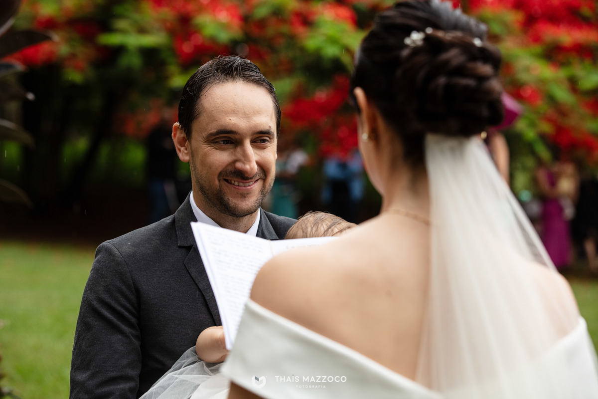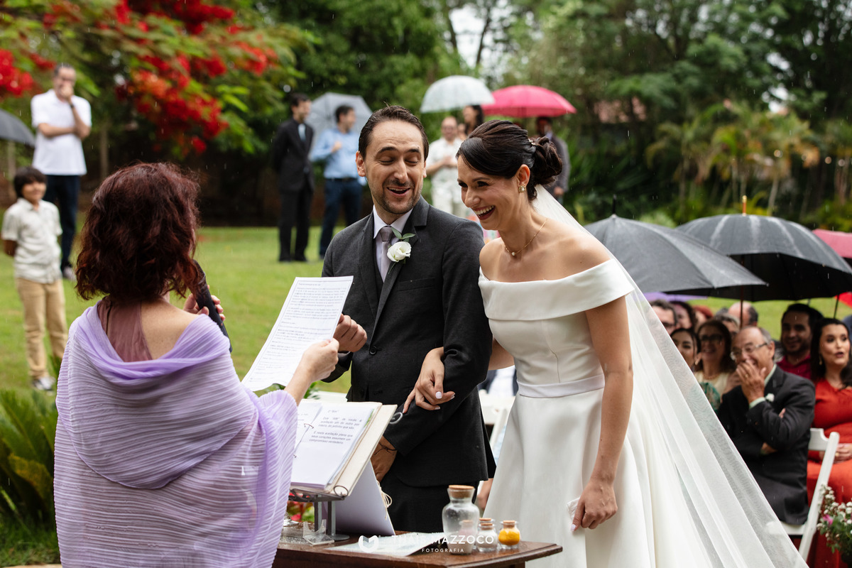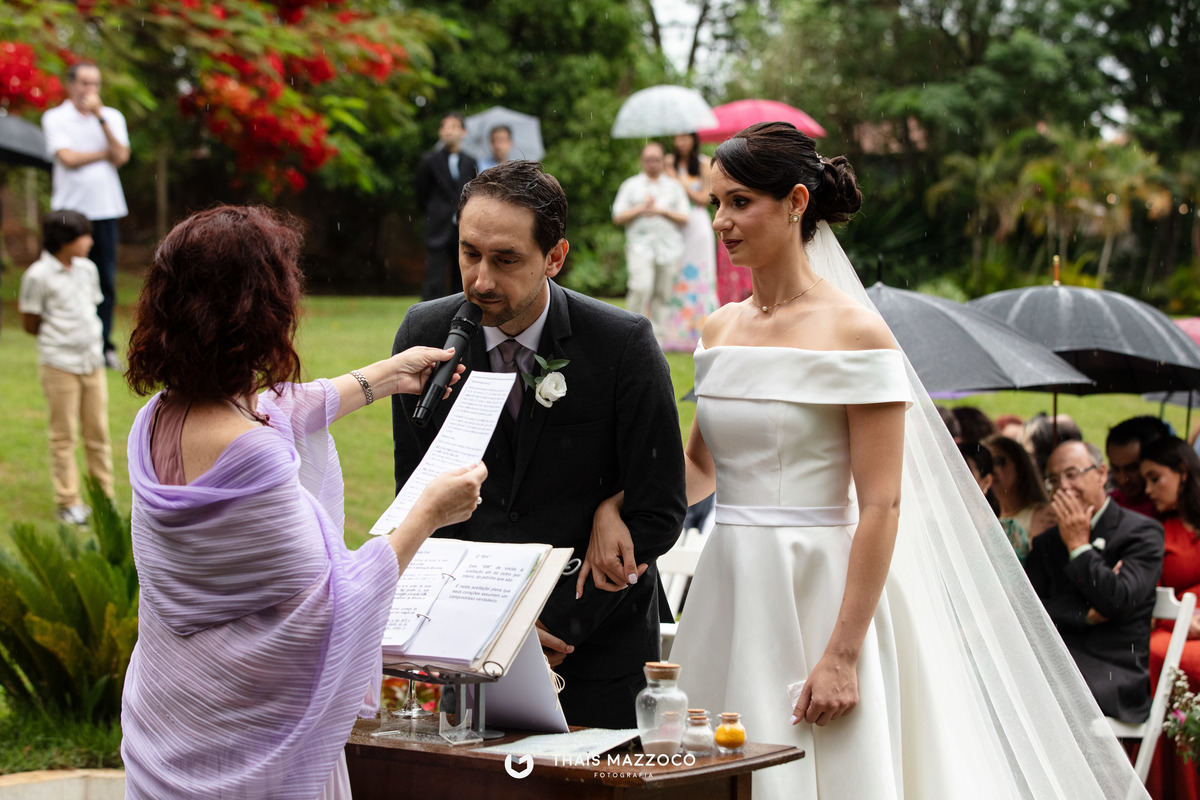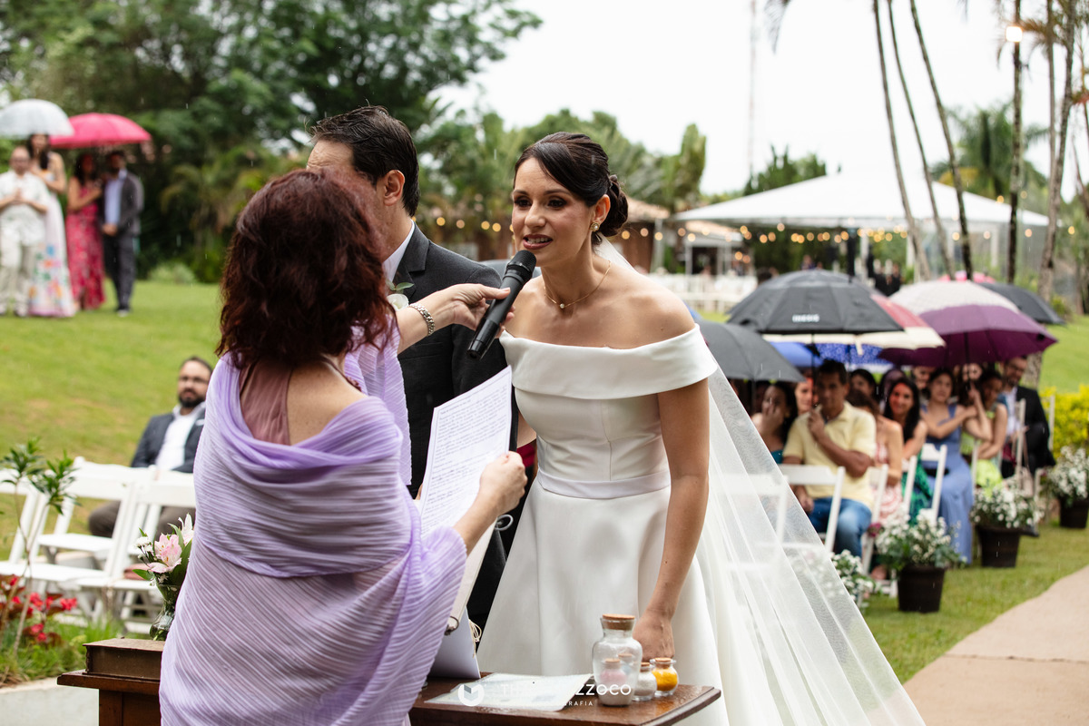A cerimônia sem padrinhos deixou tudo mais dinâmico e com mais tempo para o que realmente importa, a união do casal, que contou com a cerimônia das areias coloridas, repleta de significados e conexão com a natureza.